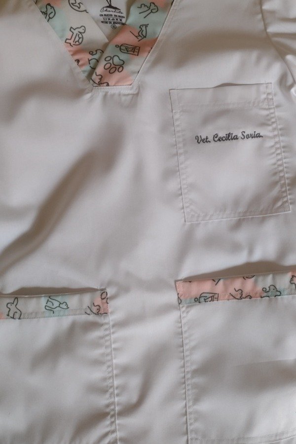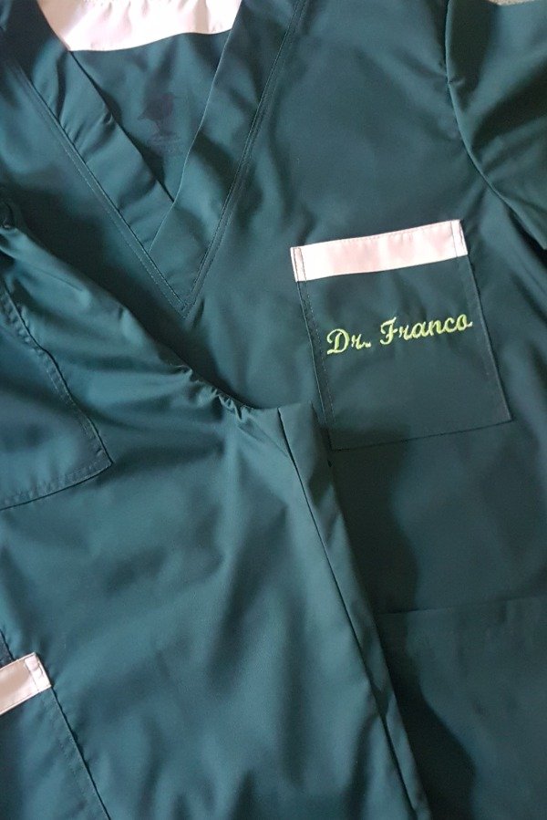El bordado se realiza con tipografía simple y profesional, integrado al diseño de la chaqueta.