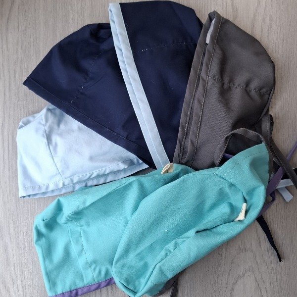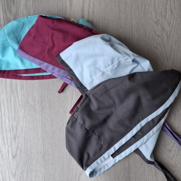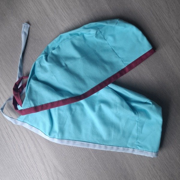 Cofia clásica, en base de tela spandex, con tiritas para atar y toallita en la frente para control de sudor.